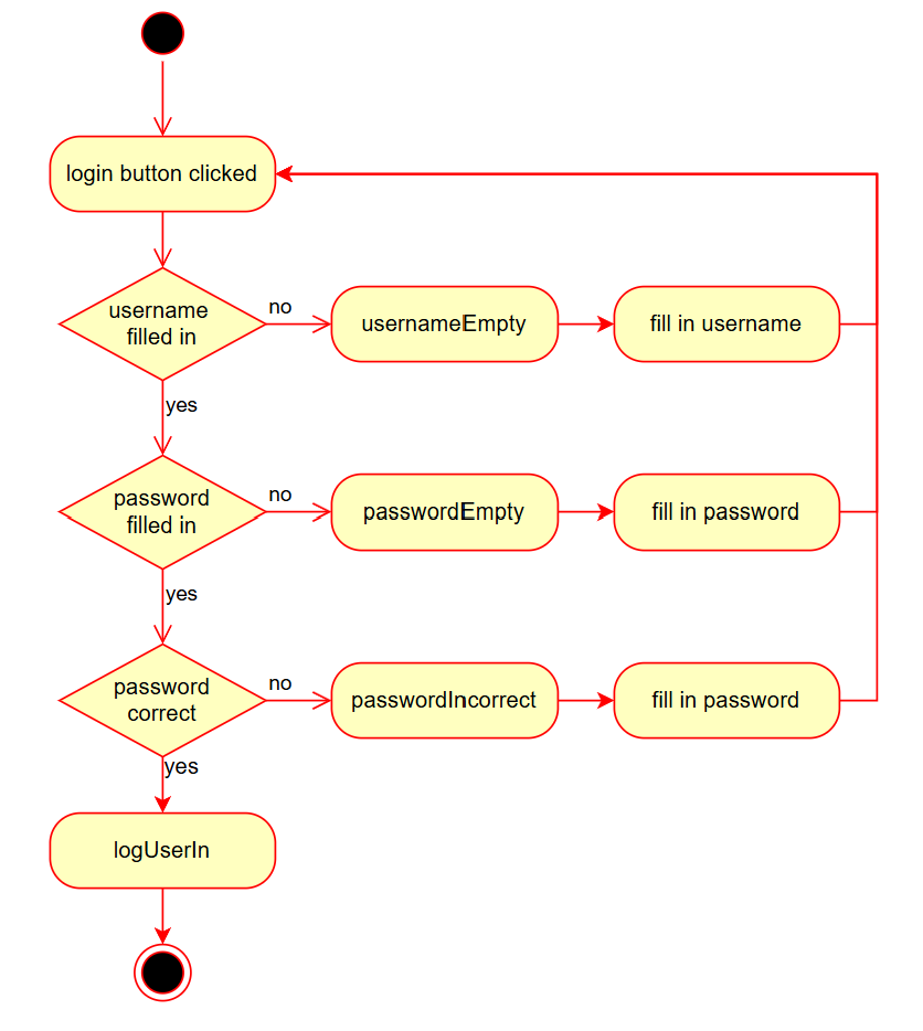 The following shows an activity diagram, which describes the flow of events when a user logs in.