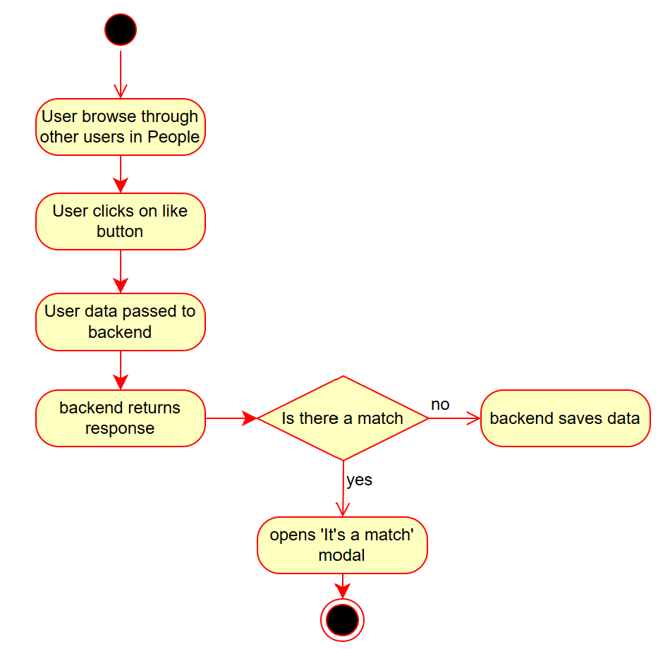 The following shows an activity diagram, which describes the flow of events when a user has a match.