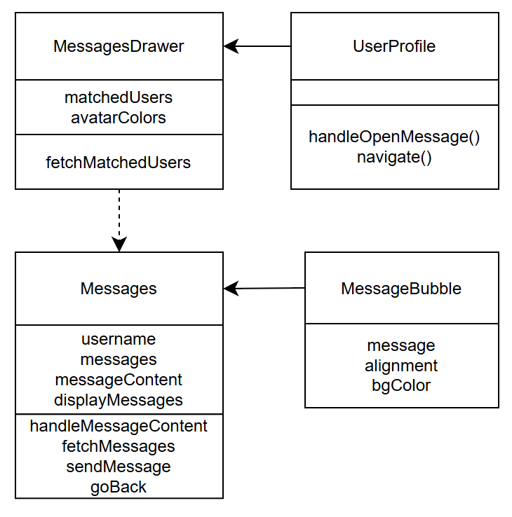 | UserProfile | Each matched user in Messages is mapped to a UserProfile component. It displays the user’s username and an avatar with the first letter of the username as the avatar logo. The color of the avatar is also randomly chosen. |